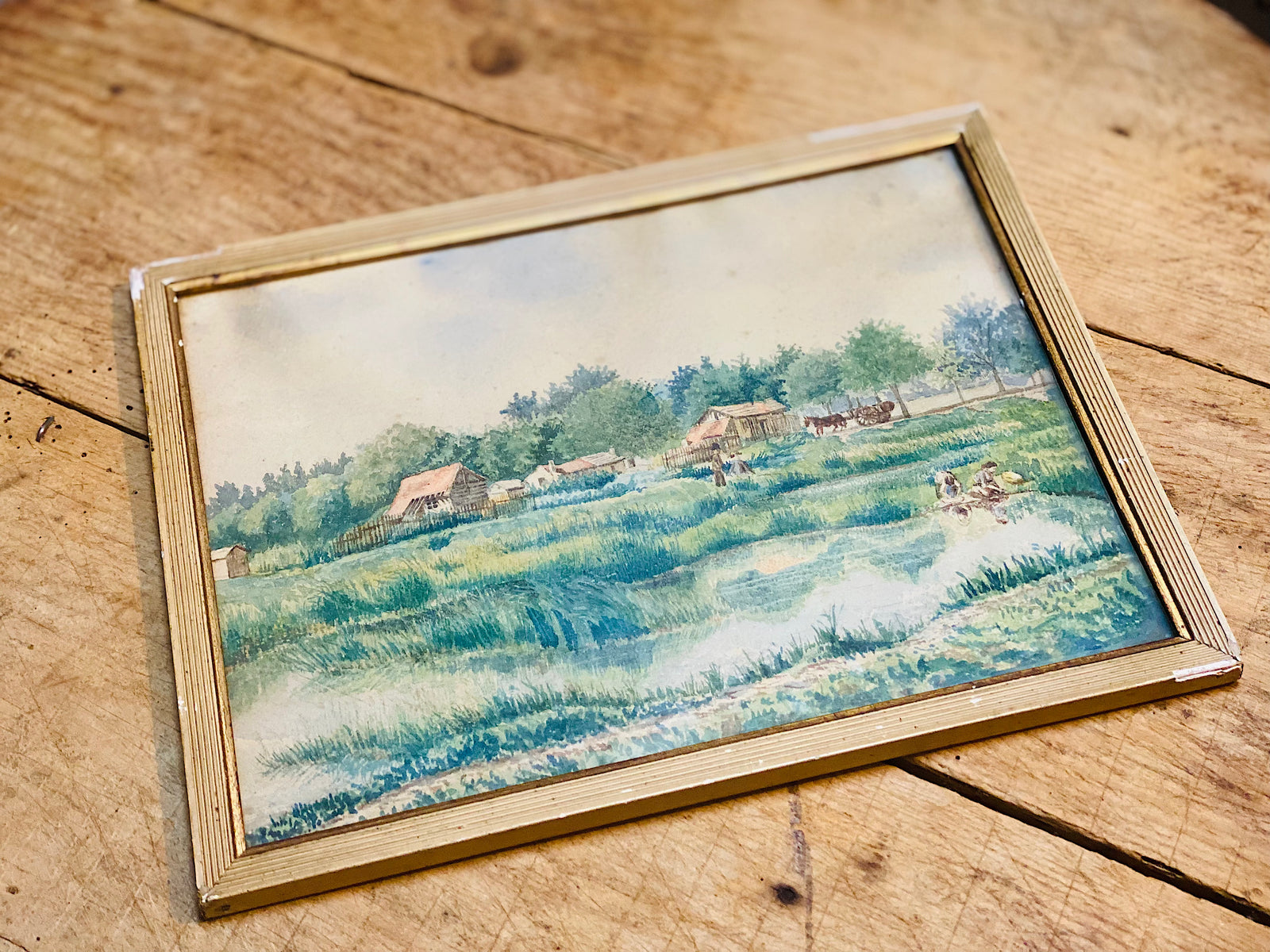 Jolie aquarelle ancienne, paysage de campagne, avec personnages et chevaux
