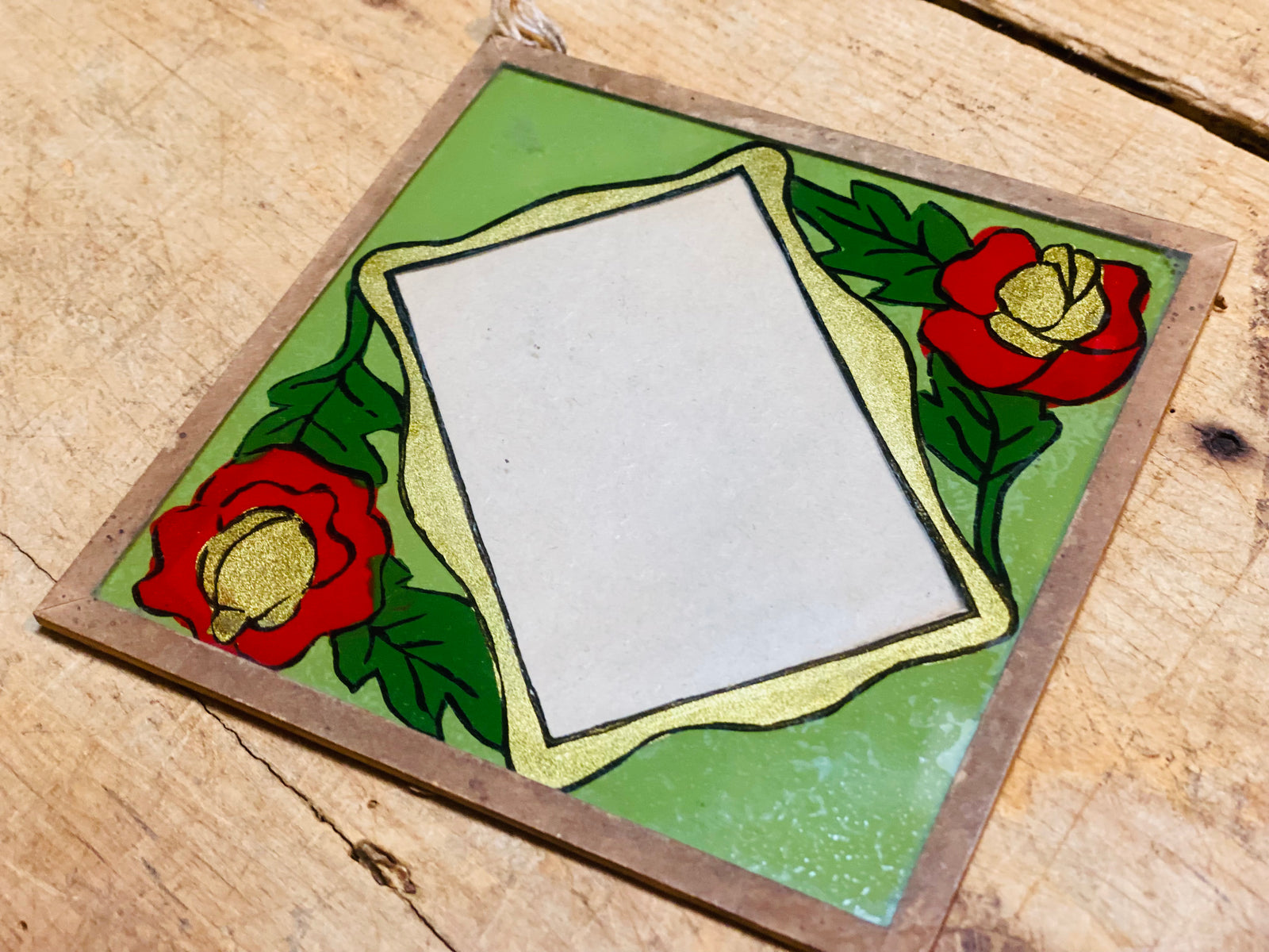 Ils sont typiques de la technique "fixé sous verre",  très répandue en Transylvanie par exemple, utilisée dans divers supports décoratifs, icônes ou sous-verre décoratifs.