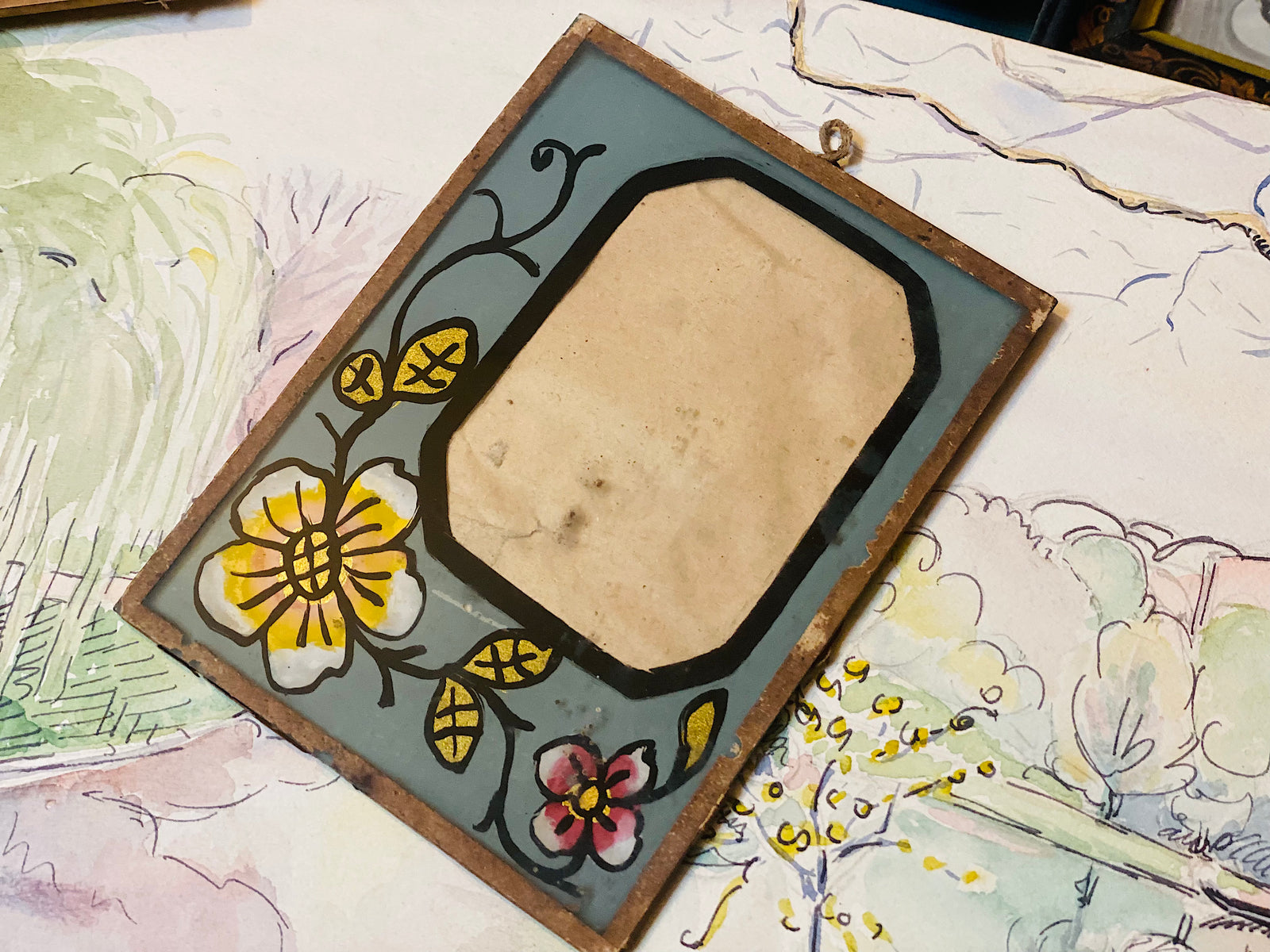 Typique de la technique "fixé sous verre", très répandue en Transylvanie par exemple, utilisée dans divers supports décoratifs, icônes ou sous-verre décoratifs.